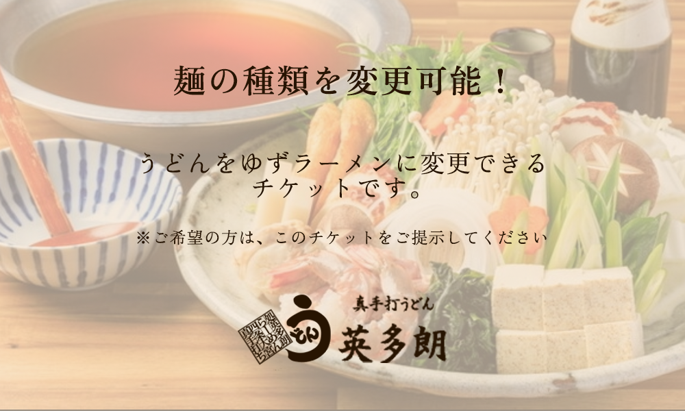 秘伝のかつお一番出だしと北海道産昆布のつゆに、たっぷりの魚介を加えていただくうどんすき。香り豊かな味わいをお楽しみください!うどんをゆずラーメンへ変更可能です。ご希望の方は、下記よりチケットをご提示してください。